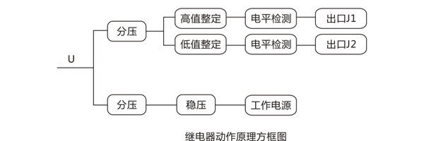 當被監視的輸出電壓的變休超過繼電器的整定范圍時(過高或過低) ,繼電器的動合(高值)或動斷(低值)觸點接通控制回路, 發出信號,即高值整定回路輸出電壓大于門相監電壓,動合觸點閉合,指示燈完 ,低值整定回路輸出電壓不小于門檻電壓,動斷觸點閉合,指示燈亮。